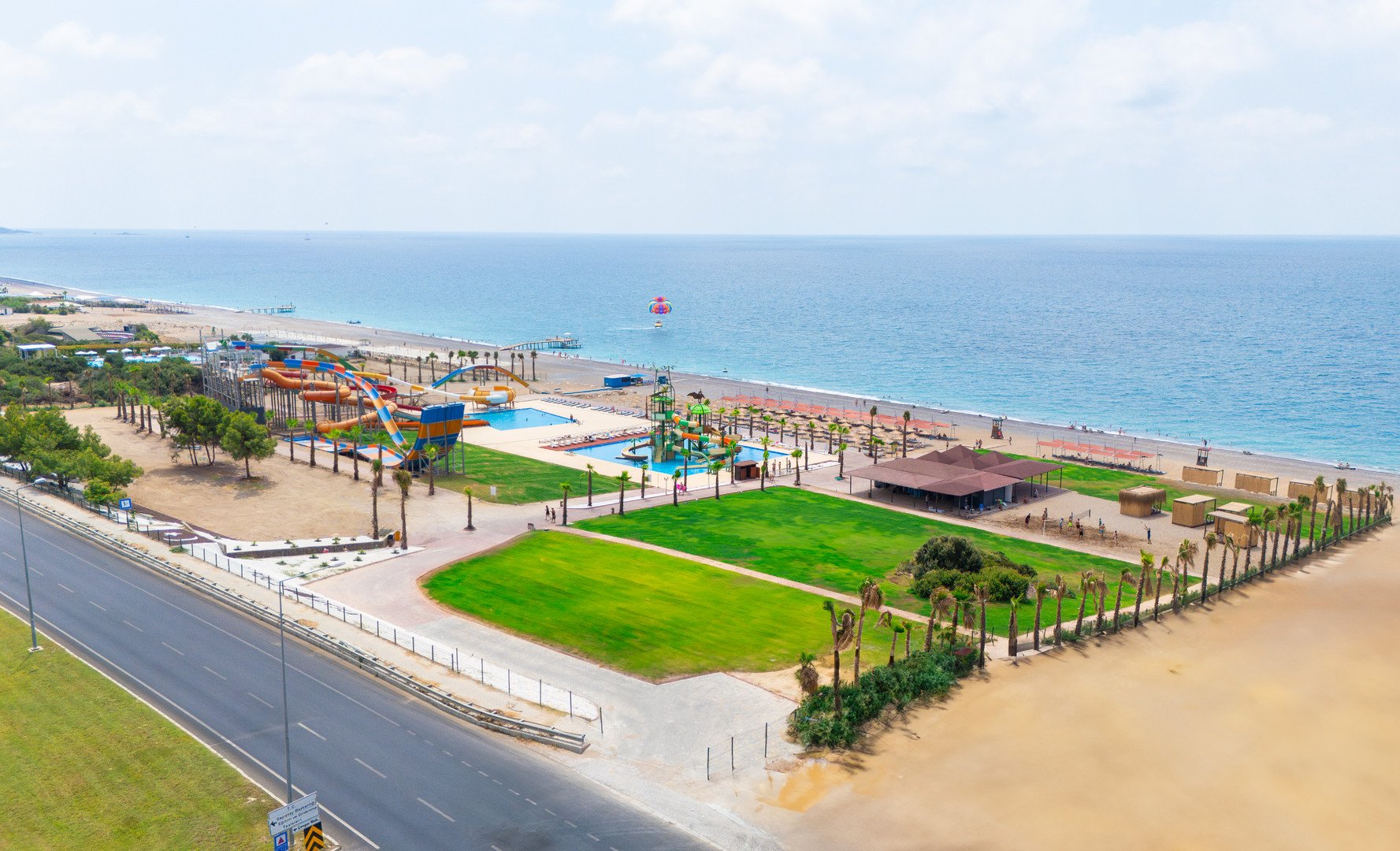 A szállodának saját partszakasza van, közvetlenül a parton és saját, csúszdás aquapark is tartozik hozzá. A partszakasz kb. 200 m hosszú, jellemzően apró kavicsos talajjal. Megközelítésére a szálloda alagútján keresztül van lehetőség. A parton található törölközők, napágyak és napernyők a vendégek számára ingyenesen használhatóak.