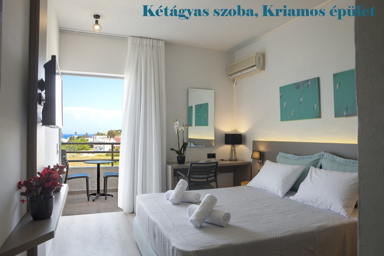A standard kétágyas szoba a Hotel Kriamos Blue épületében található, ez egy főnek pótágyazható (kanapéágy). Kb. 20 m², egyénileg szabályozható légkondival és erkéllyel. Egyéb felszerelései: fürdőszoba (zuhanyzó, WC, hajszárító), vezeték nélküli internet, műholdas televízió, telefon, hűtőszekrény, kávé és teafőző, széf. Kérésre van a szállodában vízforraló, vasaló és vasalódeszka. A Kriamos épüleben megszálló utasaink a főépület minden szolgáltatását használhatják (medencék, bárok, étterem, stb.)