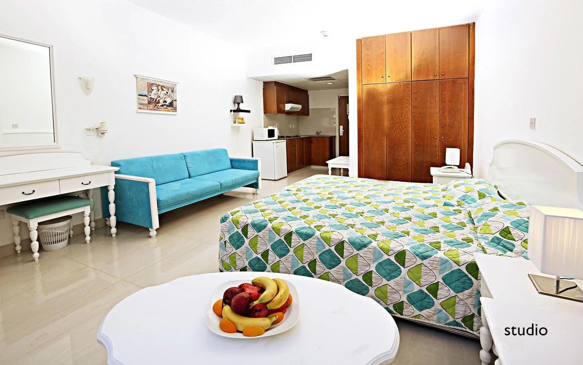 Stúdió: egyhálószobás (~25m2), praktikusan berendezett, fürdőszobás, légkondicionálóval, síkképernyős tv-vel, konyhasarok főzőlappal, hűtőszekrénnyel, vízforralóval, alapvető konyhai eszközökkel, étkező résszel felszerelt. Széf térítés ellenében bérelhető.